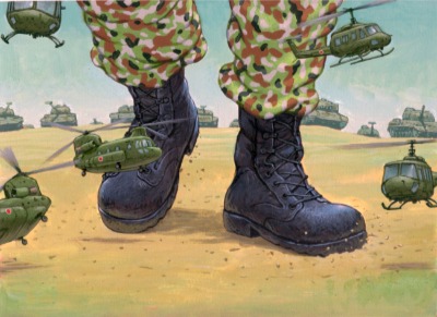 描いたのはラストのシーン。自衛隊の「特殊工作員」だった主人公の味沢が、養子として引き取った頼子を背負って演習地を疾走するのですが、追いかけて来る自衛隊員たちと対峙(たいじ)し、装甲車両や歩兵部隊に向かって突撃するところで映画が終わります。