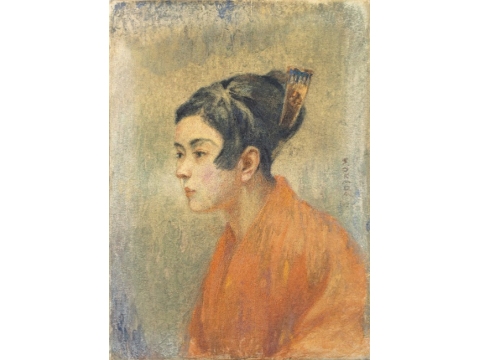 美人画で知られる洋画家の岡田三郎助。本作はカンバスに日本画で用いる岩絵の具で描かれた。その細かい粒子が、原料である鉱物特有の粗い質感を画面に与えている。本展では同じ女性の横顔の絵がほかに2点並ぶ。同様の色を使って油彩で描いたものが1点、もう1点は女性の服を青い浴衣に変えたもので、こちらも油彩だ。