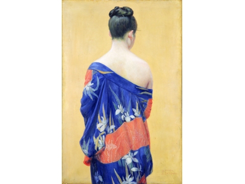女性の左肩から右腕へ、白い背中を斜めに横切る着物の襟の線。そして右の腰あたりから左下に向かって、赤い帯状の模様が青い布地とコントラストをなして流れる。視線を誘導する構図や、しなやかな着物の線や質感。岡田三郎助の真骨頂といえる代表作だ。