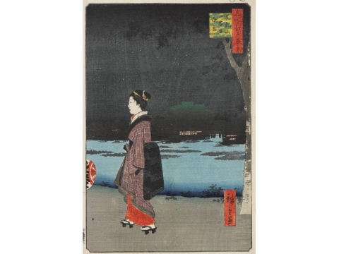 夜の光を表現した浮世絵が並ぶ本展。電気がなかった時代の日没後の世界に描かれた、今はなき文化を紹介している。
