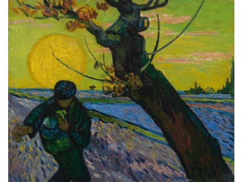ただ、ミレーの絵に木はない。この頃のゴッホは、日本の浮世絵に傾倒していた。「画面を分割する大胆な構図は、浮世絵の影響だと考えられます」と石崎さん。独特の色調は、ドラクロワの色彩理論を採り入れたものだと言う。「多方面への憧れを素直に吸収し、自らの表現として結晶させています。大きな太陽には、一日の労働を終えた農民への共感を込めたのではないでしょうか」