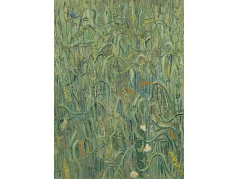 ゴッホは繰り返し麦畑を描いた。学芸員の石崎尚(たかし)さんは、「ミレーやブルトンの描く農村や農民の姿を敬愛し、『麦の声がする』と表現しています。また、西洋文化における麦は、生命の繁栄や循環の象徴でもあります」と話す。ただ、構図がない作品は珍しく、画面いっぱいに麦畑を描いた本作は意味深だとも言う。