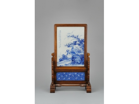 板状の陶磁器に絵を焼き付けた「陶板」。本作は、染付磁器の陶板を用いた衝立だ。