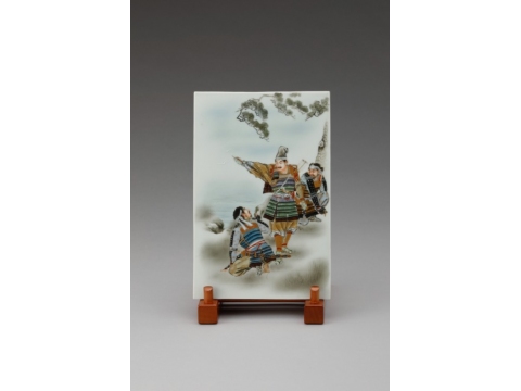 よろいの色や金彩が鮮やかな本作。瀬戸で焼いた加藤の板に、横浜で絵付けが施されたと考えられる。1色ずつ色をのせ、その絵の具に適した温度で焼く工程を繰り返す上絵付けの技法で作られた。