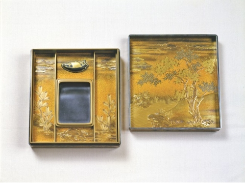 ふたの内側には川辺に咲く満開の桜。箱の下部には若松が根を張り、上を流れる川には硯に水を注ぐ水滴の舟が浮かぶ。身とふたを並べると、川の流れがつながるようになっている。