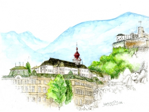 オーストリア・ザルツブルクは、このミュージカル作品の舞台です。主人公マリア(ジュリー・アンドリュース)が過ごした修道院が残っていました。陰影の深い、これはスケッチせねば、と感じさせる建造物でした。