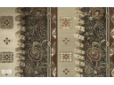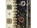 黒地が効果的に使われた「フランス唐花」は、明治時代の帯の試織(試し織りしたもの)です。中世フランスの宮廷貴族の衣装がモチーフで、当時はかなりモダンな柄だったはず。織物に欠かせない正絵(デザイン画)がセットで残っている点が非常に貴重で、制作過程の工夫を知ることができます。