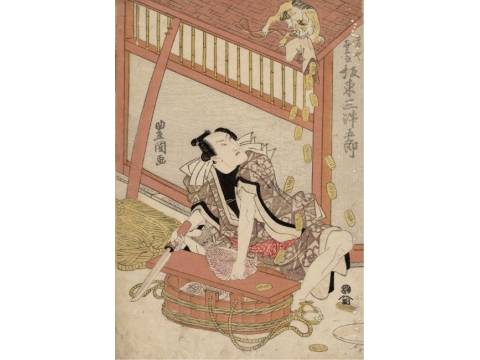 魚をさばく男と見つめ合う猫。くわえた巾着から、黄金色の小判があふれ出る。この浮世絵「肴(さかな)や喜三郎坂東三津五郎」(1816年)の題材は、貧しい魚屋に猫が小判を届けた――という瓦版の話題を採り入れた歌舞伎「褄重噂菊月(つまがさねかねてきくづき)」。役者絵の名手、初代歌川豊国(1769~1825)の作です。