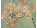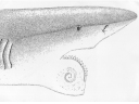 軟骨魚類は体の大部分が軟骨でできているため、化石で残るのは歯や石灰化した骨の一部がほとんど。ここまできれいな状態で残っているのは極めて珍しい。白い歯や肝臓と思われる部分も確認できます。
