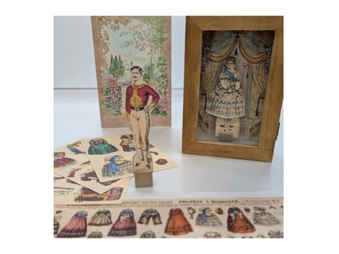 男女の人形2体に17種類の服と小物がシートに印刷されていて、切り抜いて遊ぶ。当時の現物に近づけるため紙の厚さや質感にもこだわった。商品の箱は窓付きで、付属の背景と人形を入れて飾ってもおしゃれ。