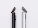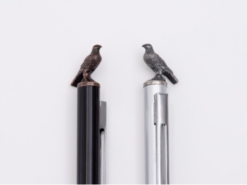 希代の金工師・鈴木長吉(1848~1919)が腕をふるい、日本の工芸を美として万博の場で世界に知らしめた作品「十二の鷹」。金沢市の国立工芸館では、重要文化財で目玉収蔵品の鷹を約50分の1スケールにし、頂に鎮座させたボールペン(1100円)を販売している。