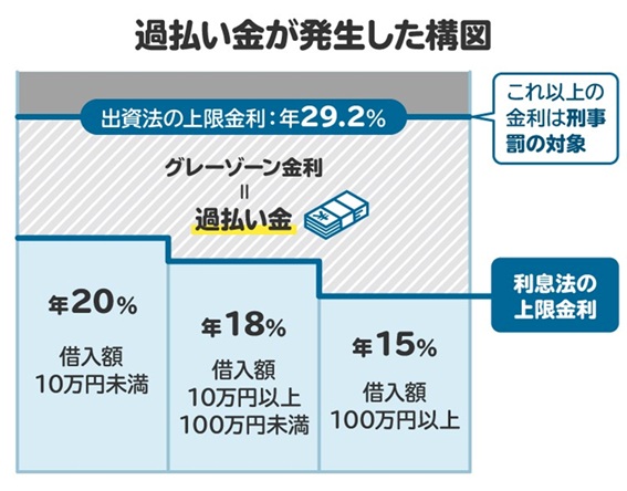 過払い金が発生した構図。過払い金とは、利息制限法の上限を超えて貸金業者に払い過ぎた利息のこと