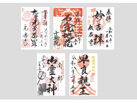 企画の目玉は特別御朱印の授与。期間中、元興寺、十輪院、般若寺、御霊神社、崇道天皇社の5社寺で、「古くて新しい奈良の意匠」をコンセプトに新たにつくった印などを押した特別御朱印を授かれる。元興寺は奈良時代から伝わる軒丸瓦と平瓦、十輪院は建築部材の蟇股(かえるまた)など、印面に各社寺の特徴がデザインされている。