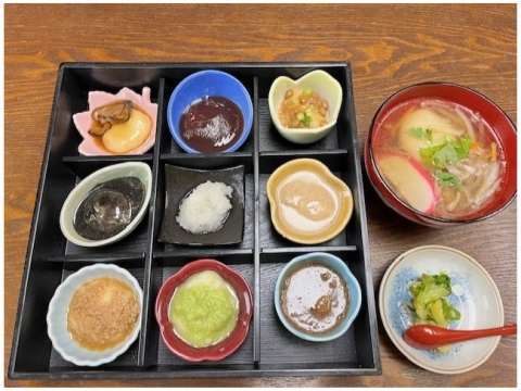 ずらりと並んだ餅は、小豆にくるみ、納豆、ゴマ等々、甘辛さまざまな味付けが施され、更にそこに汁物を兼ねた雑煮や本膳にも欠かせない大根おろしが添えられる。こう書くとすぐにおなかいっぱいになってしまうのでは?と思われる方もおいでだろうが、なにせすべてが搗き立ての餅なので、その柔らかさと温かさに惹かれて、ついついつるつるといただけてしまう。甘い餅と辛い餅の間に大根おろしをはさむことで口の中がさっぱりして、次の餅が美味しく食べられる。