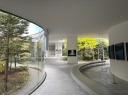 入り口の自動ドアが開くと、光あふれ、広々とした空間に息をのむ。白とグレーを基調とした館内の床は緩やかに起伏して、外部吹き抜けの中庭から自然光が柔らかく差し込む。中庭に植栽されたカエデなどの木々の緑に癒やされる。