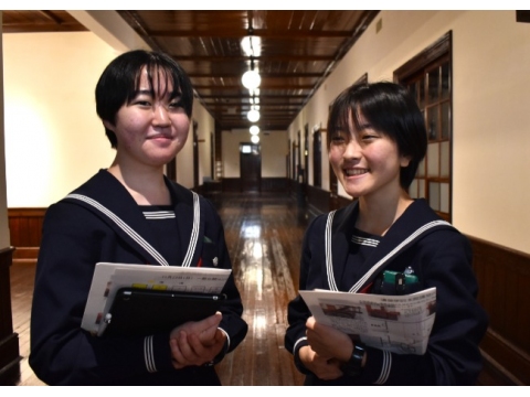 「こちらに見える階段は、お菓子のポッキーのCM撮影に使用されたことからポッキー階段の愛称で親しまれています」。11月中旬、高校2年の柳川桜子さん(17)と下町李(もも)さん(17)が校舎を記者に案内してくれた。タブレットを見ながら説明し、時には「3・6メートルもの廊下の広さはなかなか珍しいと思います」などと自身の感情も織り交ぜる。