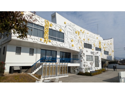 母は館の完成を待たずに他界。母をモデルにしたとされる「顔」のレリーフが、外壁の中央で穏やかな表情を浮かべているように見えた。