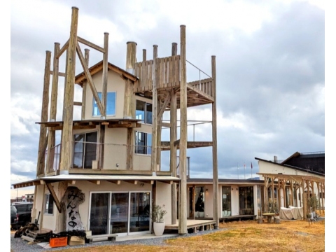建物を支える19本の太い丸太は、津波の塩害で立ち枯れた「気仙杉」。外階段がらせん状に囲み、1階は飲食スペース、2階に和室やバルコニー、最上部には物見台がある。屋内には巨大な丸太が露出し、陸前高田市内に残る「奇跡の一本松」を思わせる。