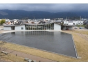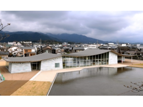 「現存12天守」の一つに数えられる丸岡城の眼下の観光情報センター。五角形の水盤はかつてのお堀を思い起こさせる。