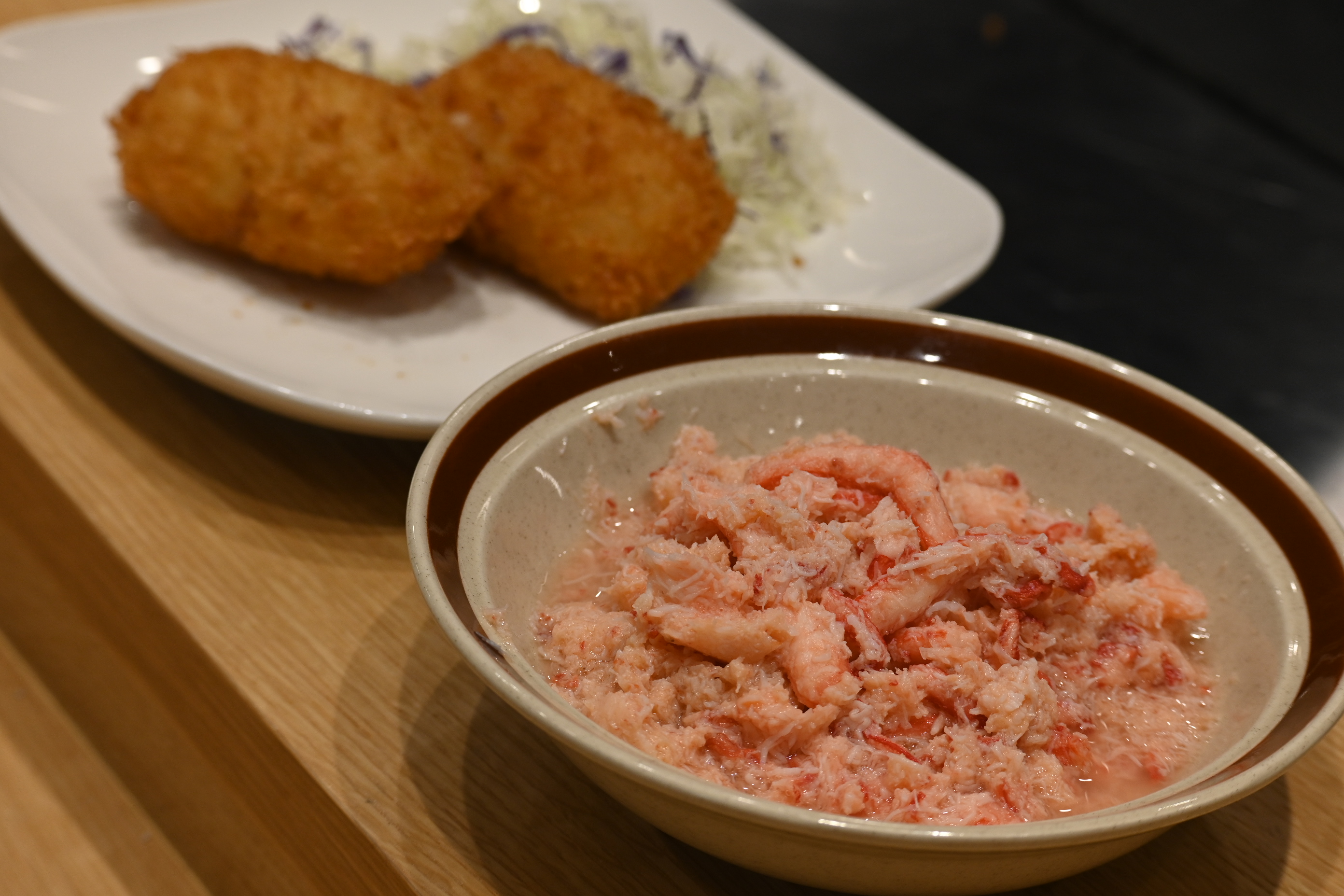 衣はサクッと軽やか。割るとオレンジがかった濃厚なクリームがとろりと流れ出し、中からはカニの身がしっかりと顔をのぞかせました。熱々を一口ほおばれば、カニの風味が広がって、まさに「すごいカニクリームコロッケ」。クリームもなめらかで、今まで食べていたカニクリームコロッケとは別物でした。