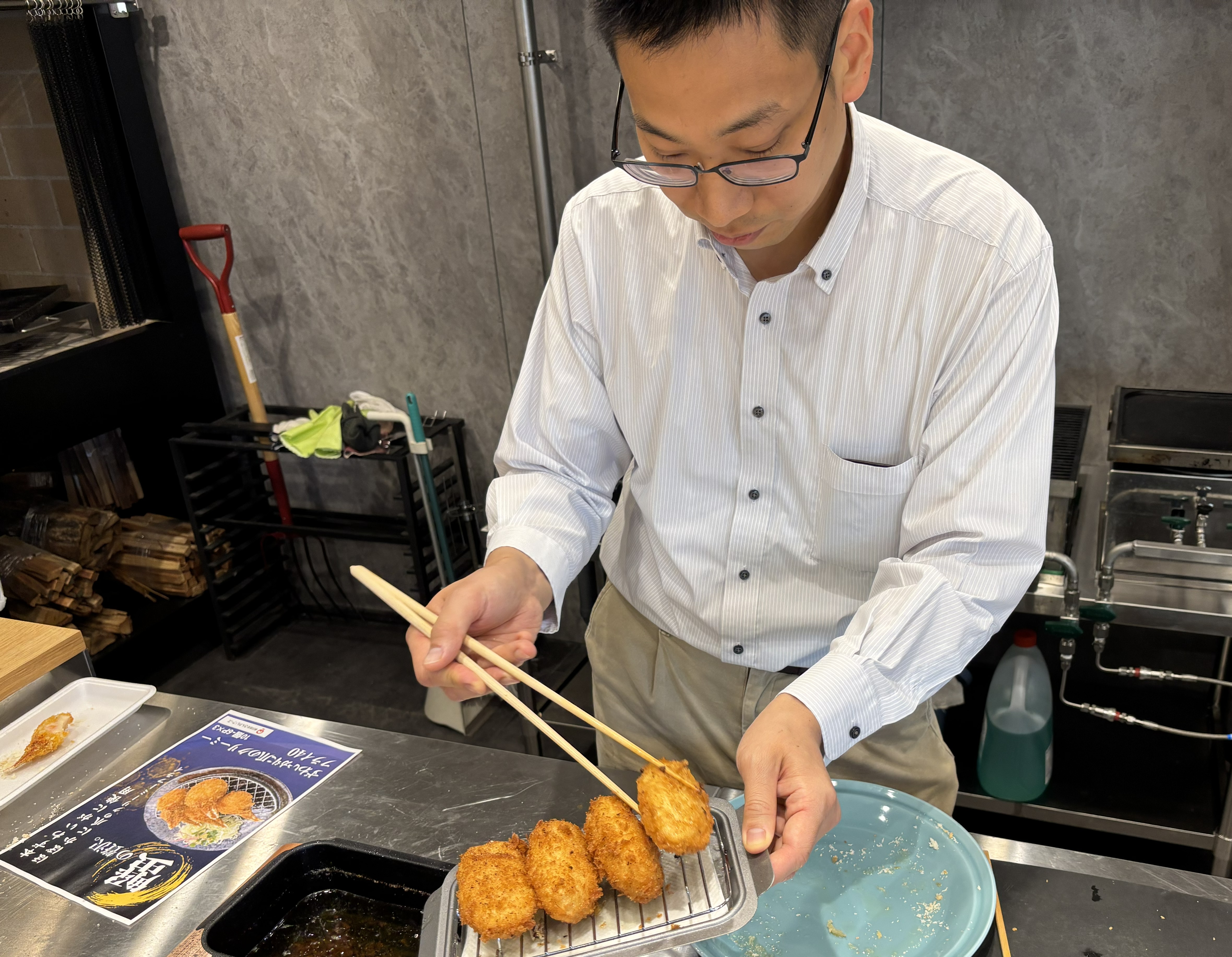 「滑らかさを優先したので効率は落ちます。でも舌触りが全然違うんです」。なめらかなクリームを守るため、衣は二重構造。カリッと感を出しながら、中身をやさしく包み込みます。「破裂しないように何度もテストしました。170度の油で6分半、その後10分余熱で火を通すのがベストです」。