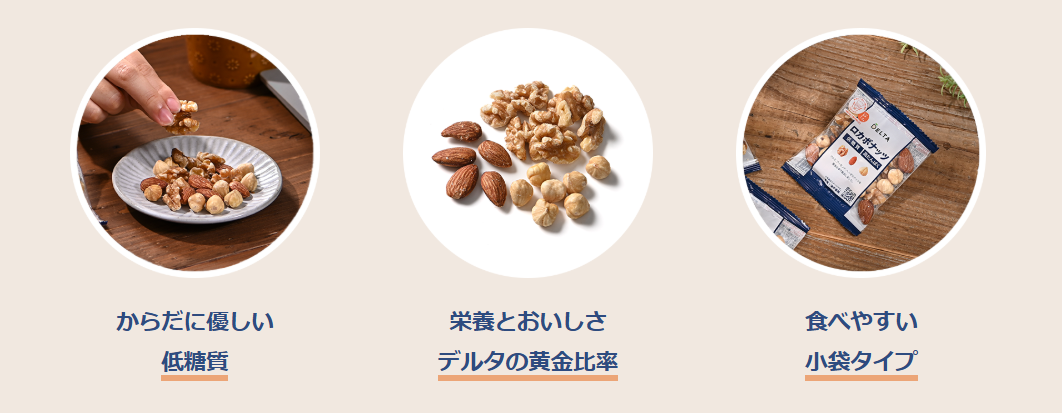 「ロカボ」とは、おいしく楽しく適正糖質を摂ること。ロカボナッツはヨーロッパで行われた研究を参考にし、デルタインターナショナルが栄養バランスを考え独自に配合した黄金比率のミックスナッツ。食物繊維、オメガ3(n-3系脂肪酸)、鉄、亜鉛、ビタミンEを多く含むという。