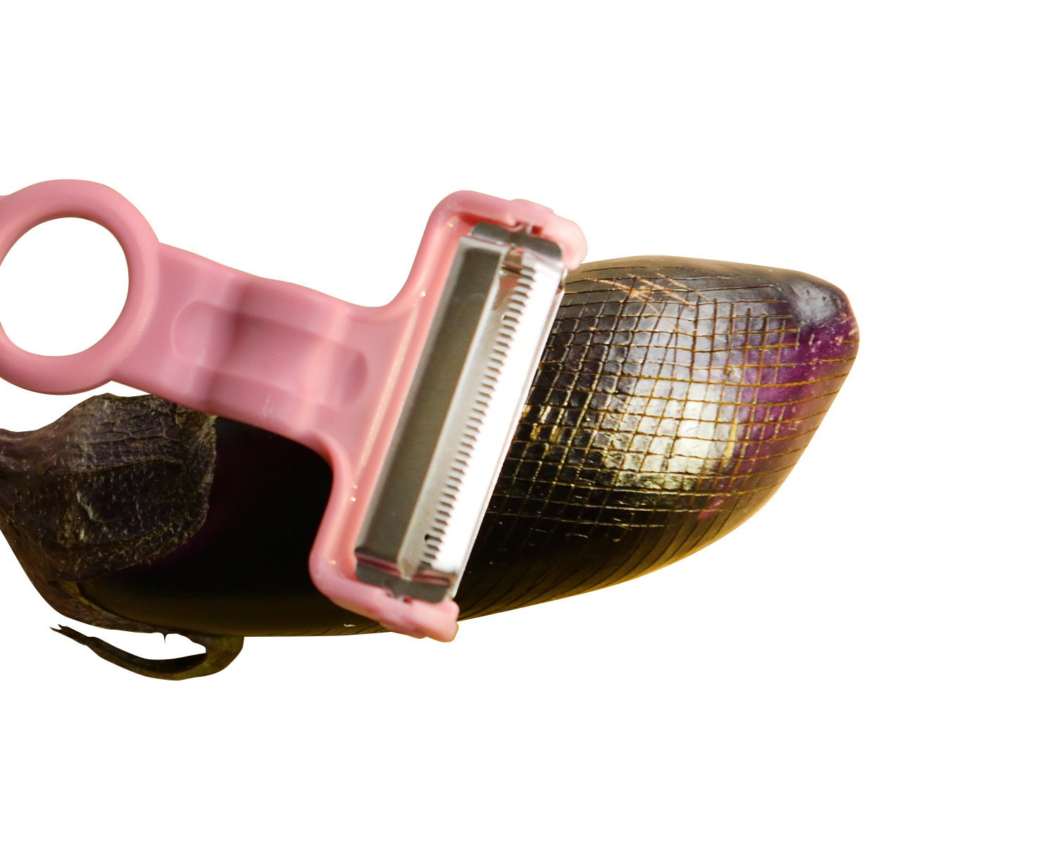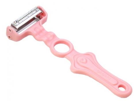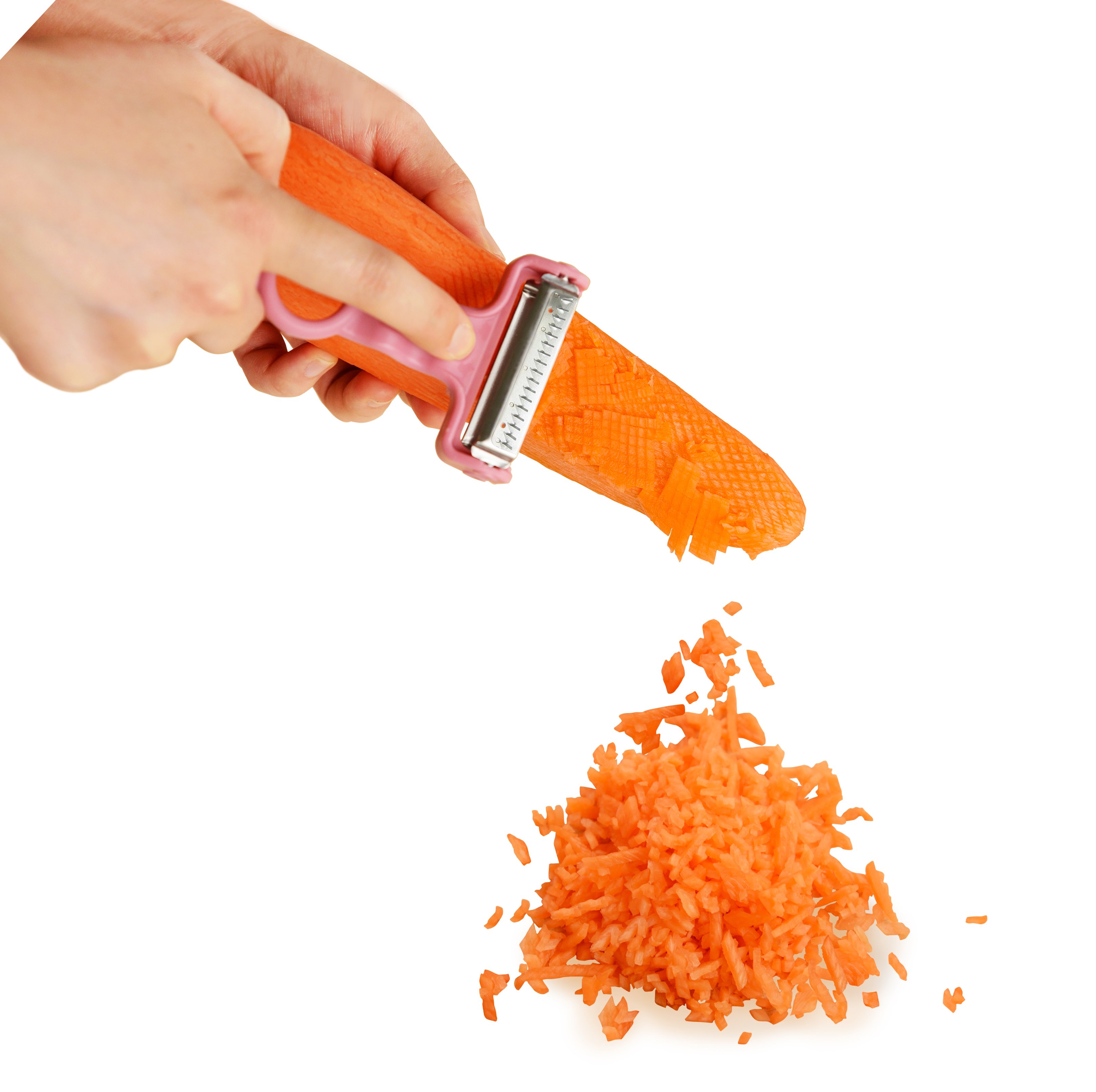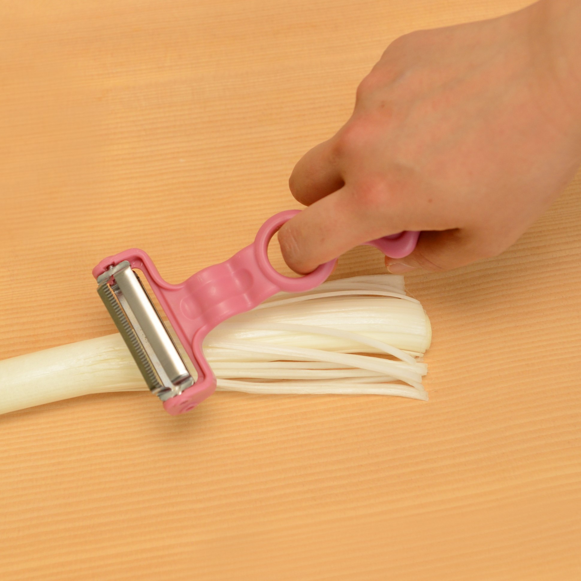 表面は「スジ切り」「みじん切り」用の凸刃、裏面は「千切り」や「スライス(輪切り)」用のギザ刃の両面仕様で使い分けができる。皮むきにも使える。