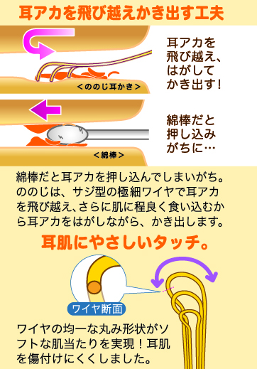 ワイヤが無理な力を吸収するため、力の入れ過ぎや、かき過ぎを予防できる。肌触りがソフトで、優しいかき心地。3連ワイヤ構造は、耳アカをしっかりかき出し、綿棒にありがちな耳アカを奥に押し込んでしまう心配がない。その柔らかな使い心地が口コミで広がり、2024年には累計販売本数が700万本を突破した。