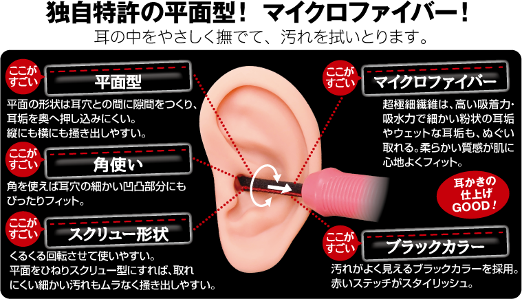 かくのではなく、ぬぐい取ることで、耳肌を傷つけない。強い吸着力で耳垢もスッキリ。耳穴との間に隙間を作りやすい平面状のカタチなので、耳垢を奥へ押し込む心配もない。素材はマイクロファイバーで、速乾性にも優れ、水洗いができ衛生的。