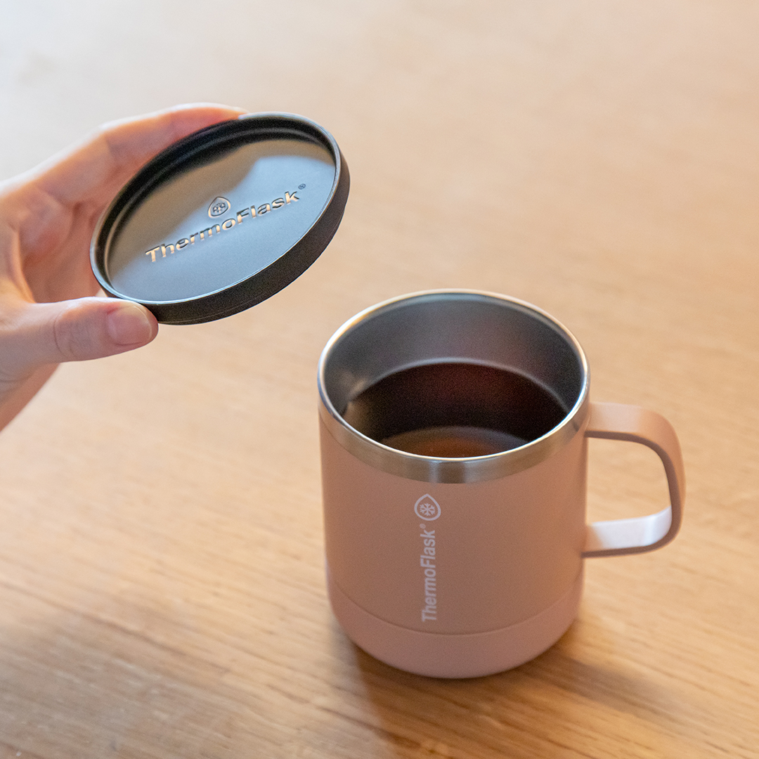 特徴はホコリなどを防ぐフタ。オフィスなどで置いたままでも清潔に保つことができ、フタは裏返すとティーバッグを置くこともできる。真空断熱構造により、温かい飲み物はしっかり保温、冷たい飲み物は長時間の保冷が可能。内側は丸底仕様のため、洗いやすく清潔を保ちやすいのも魅力となっている。