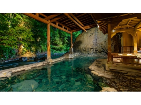 四万川沿いに立つ創業300年を超える老舗。日没後にはライトアップする四万川を二つの露天風呂から満喫。薬師の湯がある温泉ラウンジでは、源泉が味わえる飲泉処も。夕食は地元産の高原野菜やブランド肉などを使った会席料理。