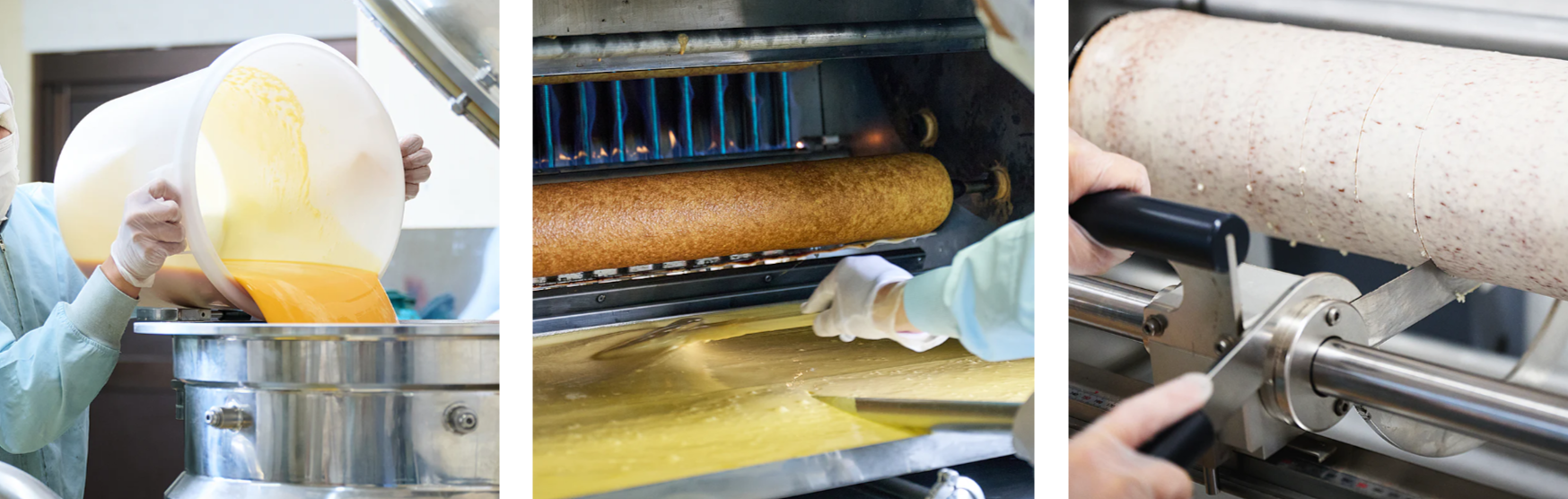 菓子製造メーカーならではの自社製造。専門のパティシエが天候や気温によって生地の配合を調整することで、ふんわりとした口当たりと豊かな香りを実現している。職人がひとつひとつ焼き上げ、手切りでカットしているのも特徴だという。