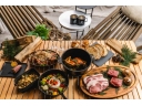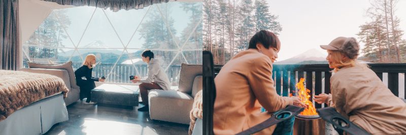 都心から車で約90分の富士河口湖町にある全天候型ハイグレードグランピング施設。各部屋専用のウッドテラスで楽しむ夕食は、地元食材をふんだんに使ったバーベキュー。