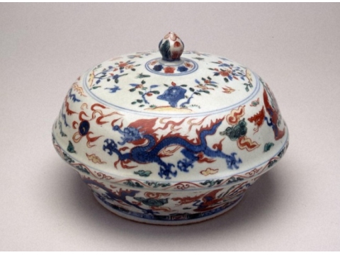 おめでたいモチーフの作品を展示する。狩野探幽「舜王・娥皇・女英図」(1665年)、景徳鎮窯「五彩龍鳳文合子」=写真=などを展示予定。干支(えと)に関連する金びょうぶ5件の展示も。