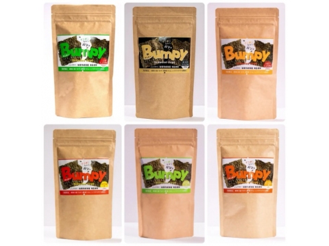 海苔加工機械の開発をしているイツワ工業が、特許製法である「スチームドライ製法」を使った海苔チップス「Bumpy(バンピー)」6種(1944円)を8人に。