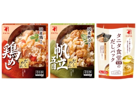 だしめしの素は「鶏めし」と「帆立(ほたて)五目」(写真左と中央、いずれも200g、2合用、486円)の2種を提供。