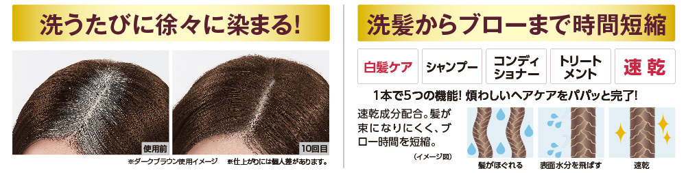 染料配合のシャンプーは、髪の表面に色素をコーティングし、洗うたびに白髪が徐々に色づく。 コンディショナー機能も。