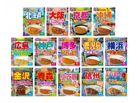 リンゴとハチミツで甘みを出し黒こしょうで辛みを利かせた「大阪 甘辛ビーフカレー」のほか、辛口の「博多 明太子(めんたいこ)チーズカレー」、「金沢 濃厚コク旨カレー」など。