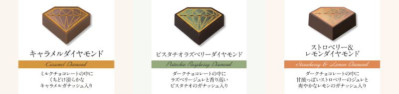 甘く香ばしい風味で人気のキャラメルと、新作の甘酸っぱいストロベリーのジュレと爽やかなレモンのガナッシュなどが楽しめる。優れたカッティングによって輝くダイヤモンドのように、二層構造のガナッシュがエッジの効いた新たな美味しさを生み出すという。