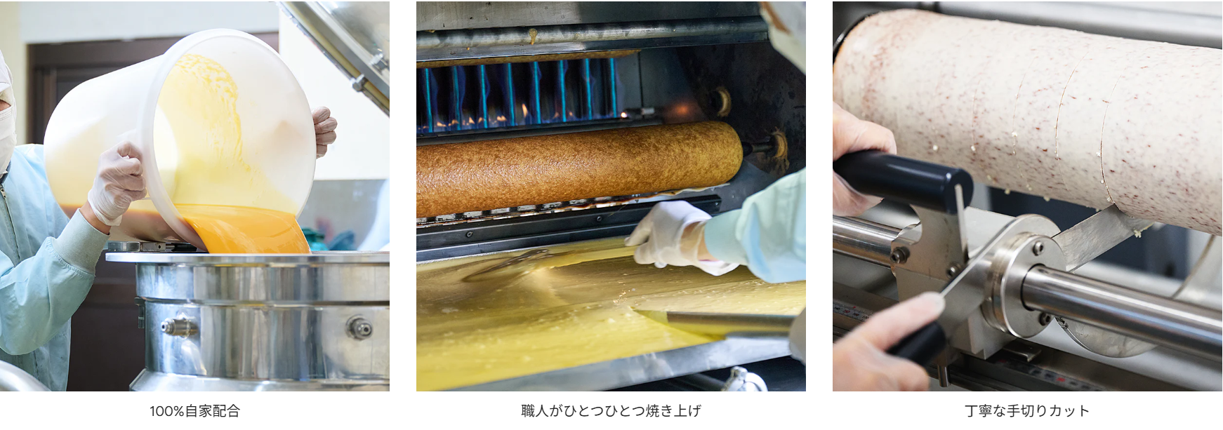 菓子製造メーカーならではの自社製造。専門のパティシエが天候や気温によって生地の配合を調整することで、ふんわりとした口当たりと豊かな香りを実現している。職人がひとつひとつ焼き上げ、手切りでカットしているのも特徴だという。