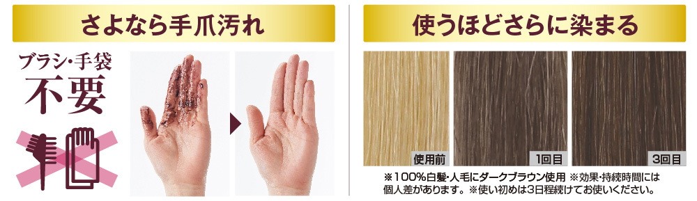 素手で使用でき、2日に1回シャンプー後になじませ、3分放置するだけで色づき、回数を重ねるとさらに色づくカラートリートメント。使いやすいポンプタイプ。