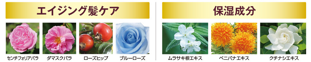 ツヤやパサつきのケアに効果があるとされるバラエキスやローヤルゼリーなどの保湿成分を配合。ふわっと広がるバラの香りで、バスタイムが優雅な癒しのひとときに。