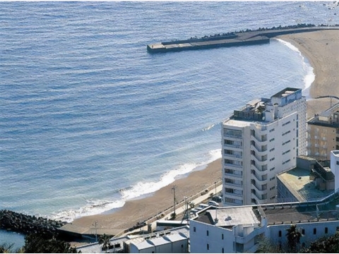 海水浴場「熱川YOU湯ビーチ」の目の前に立つ。オーシャンビューの客室から太平洋を望む。熱川温泉の掛け流しの湯を堪能。岩風呂の大浴場や四つの異なる湯船のある露天風呂など4種類の浴場が楽しめる。夕食はキンメダイの煮付けなど魚介類中心の会席料理。