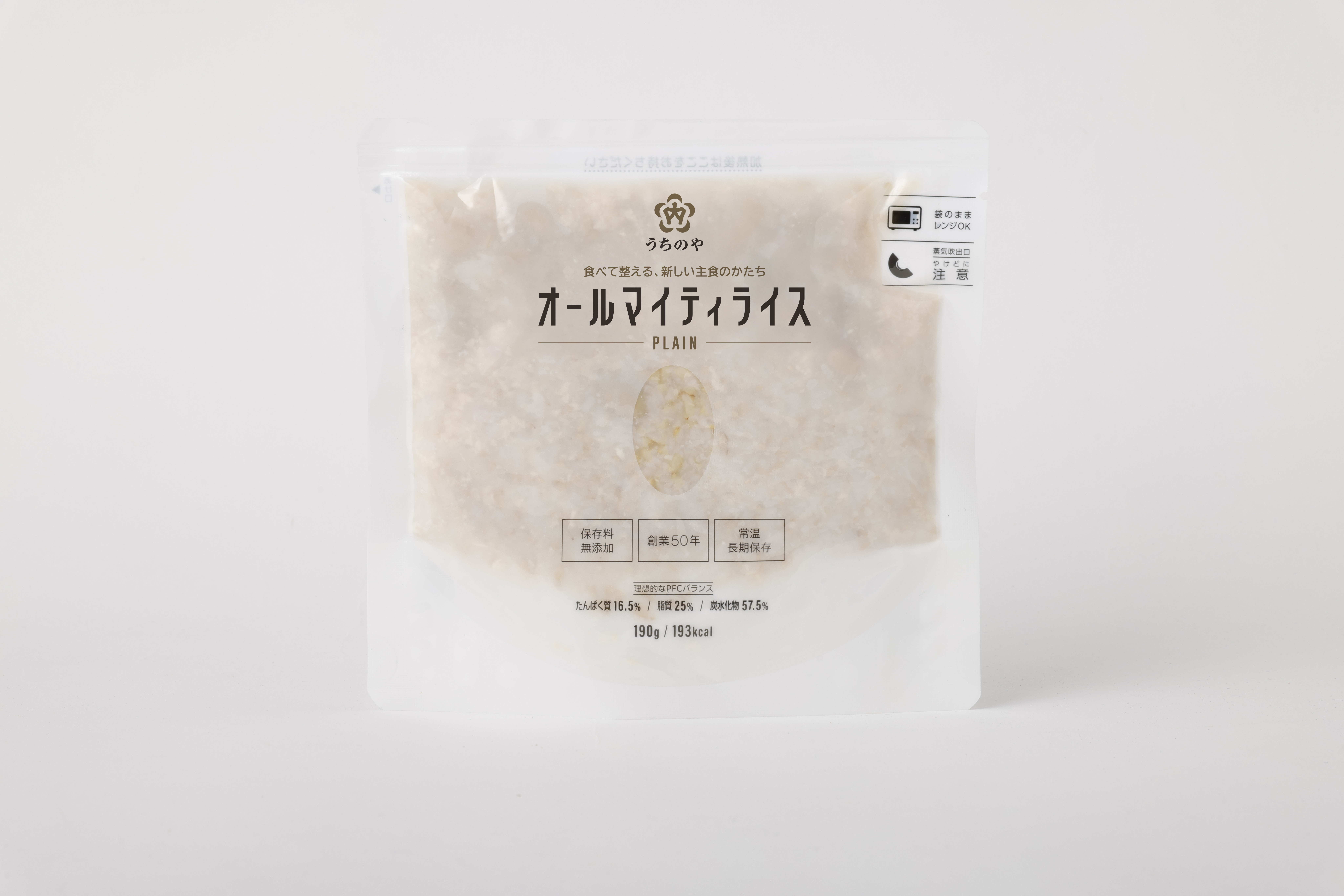 大豆、鶏胸ひき肉、玄米を使ったたんぱく質、脂質、炭水化物のバランスが整った主食。温めても常温でも食べることができる。賞味期限は製造より2年。卵を加えるなどアレンジにも適している。保存料無添加。