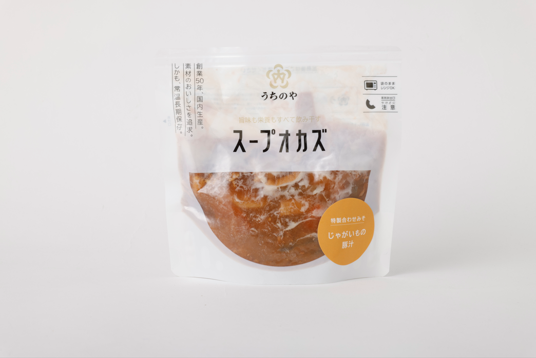 同社の「スープオカズ」シリーズ。国産じゃがいも、豚肉、こんにゃく、ニンジンなどの具材に特製合わせみそが染みこみ、ショウガの香りが豊かな風味となった一品。内容量は235g。賞味期限は製造より2年。