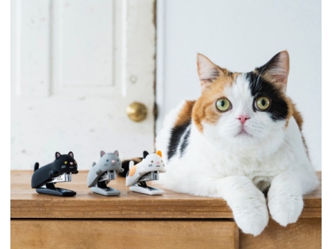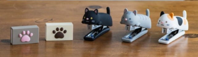 ネコ形のシリコーンカバーをかぶせたホチキスで、前あし部分に肉球をデザインした。