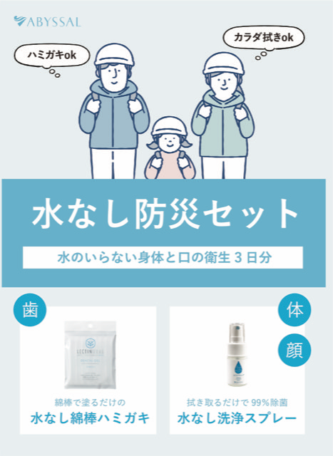 アビサル・ジャパンが、「水のいらない身体と口の衛生セット」(1人用3日分、水なし洗浄・保湿スプレー20ml 、水なし綿棒歯ブラシ6本、1100円)を15人に。