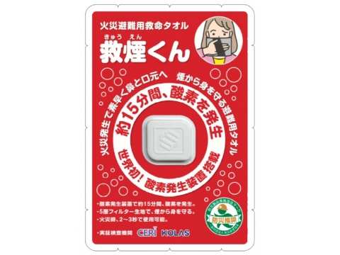 「救煙くん」は濡れたタオルの内側に酸素発生装置を搭載しており、フィルムを外すと酸素が供給される仕組みとなっている。約15分間、酸素を発生させ、有毒ガスを遮断する5層のフィルター構造の生地となっている。パッケージは12カ所から空けることが可能で、緊急時でも急いで開封することができる。