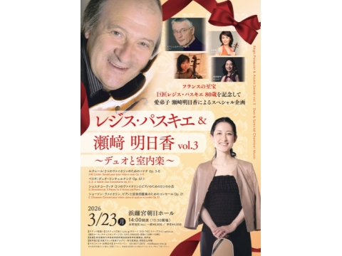 3月23日(月)午後2時、東京都中央区の浜離宮朝日ホール(築地市場駅)で、「レジス・パスキエ & 瀬﨑明日香 vol. 3 〜デュオと室内楽〜」を開催。ペア3組(6000円/人)を招待。