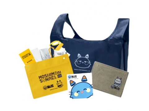 ジッパーバッグに圧縮タオル、アルミシート、カラビナ、ホイッスル、不織布マスク、防災ブックが入った防災セットのほか、エコバッグや今治ハンドタオルとふせん付き。
